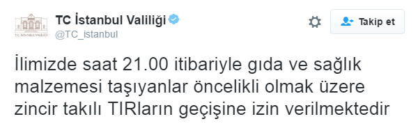 İstanbul Valiliği, saat 21.00 itibarıyla gıda ve sağlık malzemesi taşıyanlar öncelikli olmak üzere zincir takan tırların geçişine izin verildiğini bildirdi.