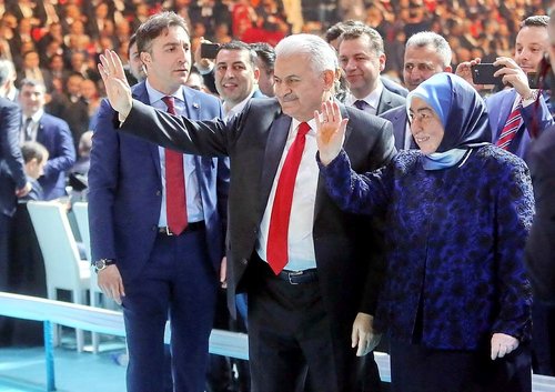 Yıldırım, selamlama konuşmasının ardından eşi Semiha Yıldırım'la, AK Parti'nin kampanya şarkılarından ilki "Tabii ki evet" eşliğinde Ankara Arena'ya girdi.