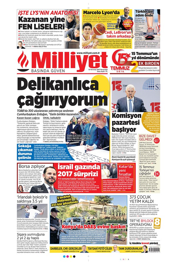 13 Temmuz 2017 Perşembe Gazete Başlıkları