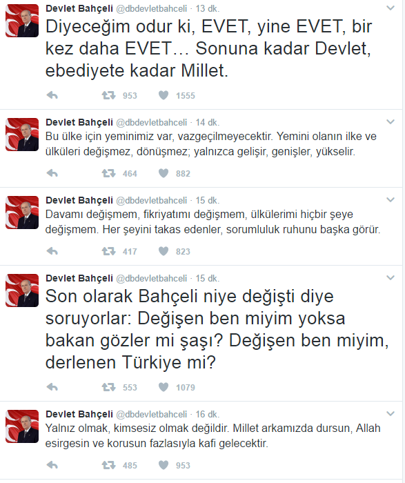 MHP Genel Başkanı Devlet Bahçeli, Twitter hesabından referandum öncesi açıklamalarda bulundu.