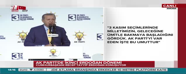 Cumhurbaşkanı Recep Tayyip Erdoğan, AK Parti 3. Olağanüstü Büyük Kongresi'nde beklenen açıklamasını gerçekleştirdi. Cumhurbaşkanı Erdoğan, 998 gün aradan tekrar döndüğü AK Parti'de büyük bir coşkuyla karşılandı. Partililere seslenmek üzere kürsüye gelen Erdoğan, bir süre partililerin tezahüratları nedeniyle konuşmadı. Kadınlara özel olarak teşekkür eden Erdoğan'ın sözleri sık sık sloganlarla kesildi.