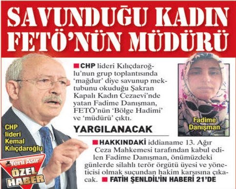 CHP Genel Başkanı Kemal Kılıçdaroğlu'nun, partisinin grup toplantısında 'mağdur' diye lanse ederek mektubunu okuduğu Şakran Kapalı Kadın Cezaevi'nde yatan Fadime Danışman'ın FETÖ'nün 'Bölge Hadimi' ve 'Bölge Müdürü' olduğu ortaya çıktı. Konuyla ilgili hazırlanan iddianame mahkemeye gönderildi.