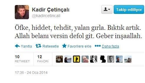Çetinçalı, "Öfke, hiddet, tehdit yalan gırla. Bıktık artık. Defol git. Allah belanı versin. Geber inşallah" diye yazmıştı.