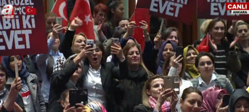 7 Haziran seçimlerinden sonra şahsımı kastederek şu anda Cumhurbaşkanlığı makamında siyaseten ve hukuken boşlukta olan bir kişi var demişlerdi. Gazi Mustafa Kemal'in partisini ve bölücü örgütün siyasi uzantısına koltuk değnekliği yaptılar. Şu anda kim hayır diyor, Kandil, terör örgütünün başı hayır diyor. Ama şu anda ana muhalefetin başındaki zat onlarla hareket ediyor. Bunu anlamak mümkün mü? Şayet seçimden sonra bu zihniyet hükümet kursaydı Türkiye'nin neler yaşayabileceğini düşünebiliyor musunuz? Şu anda hayır için Avrupa'ya gidenler terör örgütünün oradaki uzantılarıyla birlikte çalışıyorlar. İşte en son İsviçre'de şahsımla ilgili dev bir pankart astılar. Şimdi ben buradan sizler vesilesiyle tüm milletime sesleniyorum. İsviçre'nin parlamento binası önünde dev bir poster asacaklar ve orada polisin nezaretinde terör örgütleri yürüyüş yapacak ve İsviçre hükümeti ses çıkarmayacak. Biz buralara bunlarla değil milletimizle geldik.