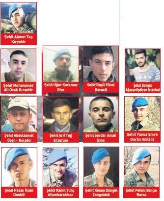 Şehitlerin isimleri şöyle: Piyade Er Yunus Emre Duran (Kırşehir), Piyade Çavuş Fehmi Barçın (Bursa), Piyade Er Serdar Amak (İzmir), Sıhhiye Er Hasan İlhan (Denizli), İstihkam Er Kenan Döngel (Sinop), Muhabere Onbaşı Abdülsamet Özen (Kocaeli), Sıhhiye Er Kamil Tunç (Afyonkarahisar), Komando Er Mustafa Cihan (Osmaniye), Raşit Yücel (Kocaeli), Piyade Çavuş Arif Tuğ (Erzurum) Piyade Onbaşı Ahmet Taş (Kırşehir), Piyade Onbaşı Muhammet Ali Ocak (Kırşehir), Komando Er Göksel Ağaçyetiştiren (İstanbul) ve İstihkam Er Uğur Korkmaz (Rize).
