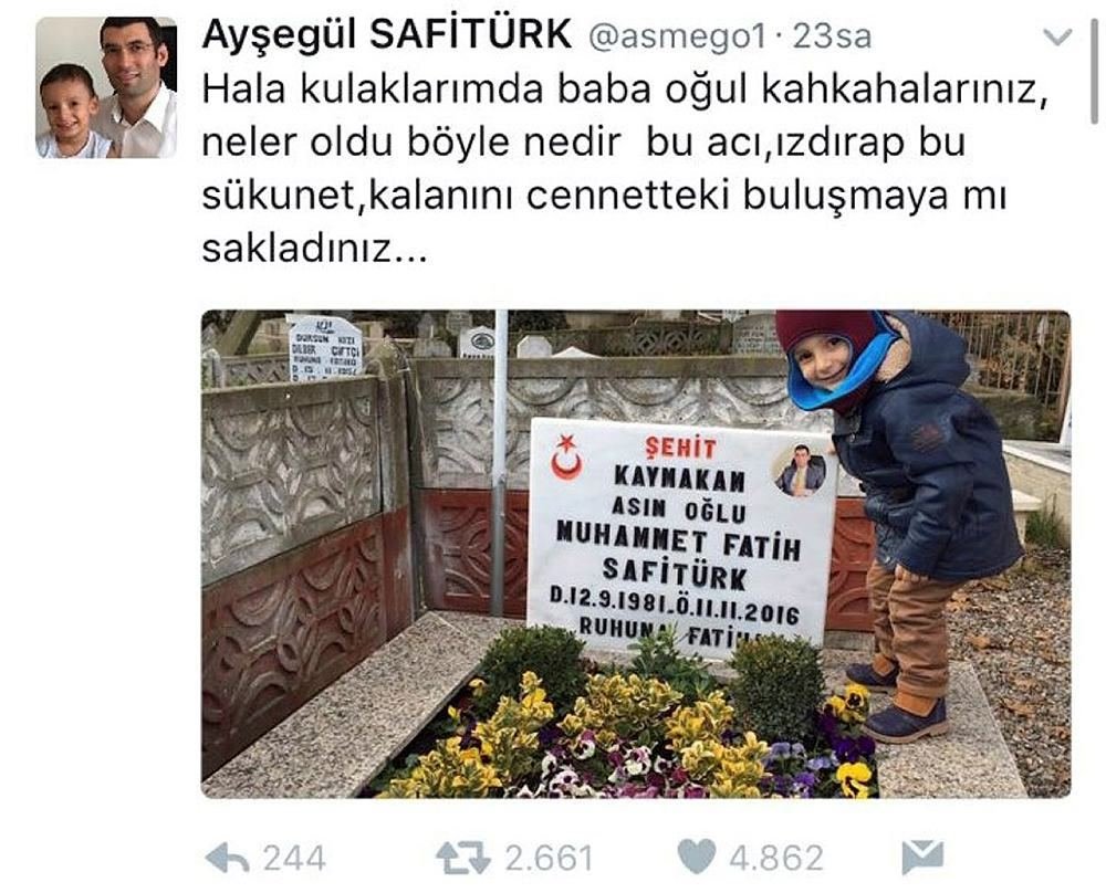 Mardin Derik İlçesinin Kaymakamı iken uğradığı bombalı saldırı sonucu şehit olan Muhammet Fatih Safitürk'ün eşi Ayşegül Safitürk, 3 yaşındaki oğlu Asım Eren Safitürk ile şehit kaymakamın mezarını ziyaret etti. Ziyaret sonrası Ayşegül Safitürk, sosyal medya hesabından paylaştığı fotoğrafla herkesi hüzne boğdu.