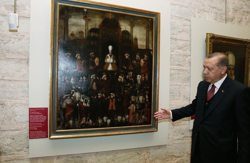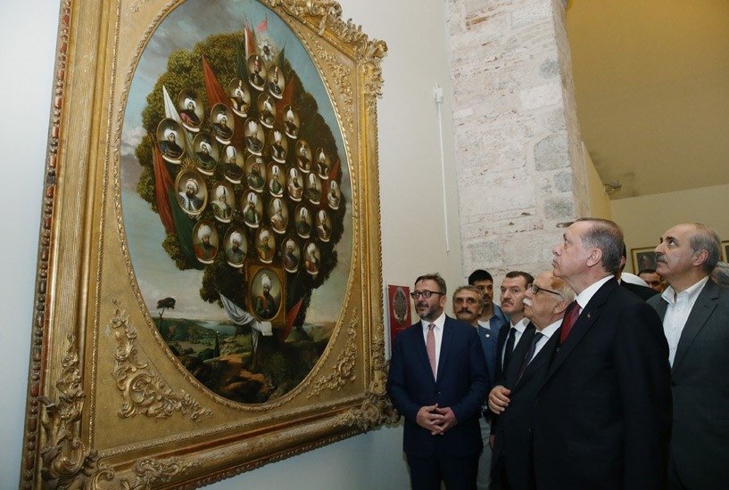 Erdoğan, tablonun üzerindeki örtüyü Kültür ve Turizm Bakanı Nabi Avcı ile birlikte kaldırdı. Bir süre sergiyi gezen Cumhurbaşkanı Erdoğan ardından buradan ayrıldı.