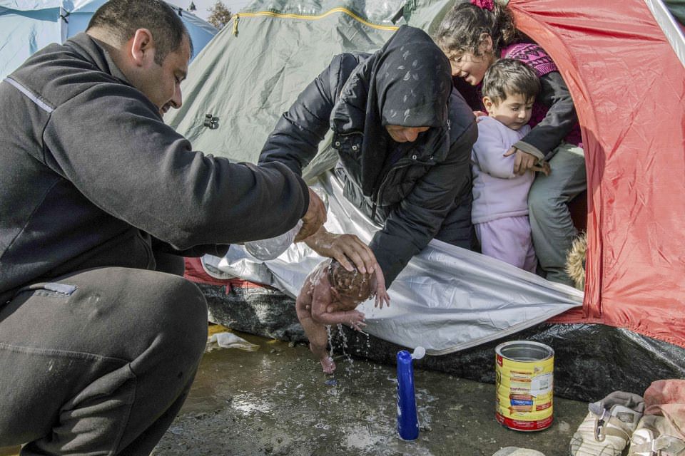 Yunanistan'ın, Makedonya sınırındaki İdomeni kasabasında bulunan sığınmacı bir aile, kendi kurdukları çadırda yeni doğmuş bebeklerini yıkadı.