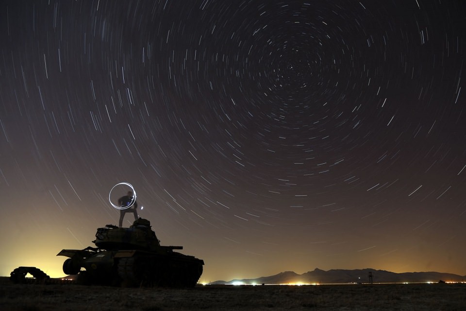 Konya'nın Karapınar ilçesindeki Milli Savunma Bakanlığı Karapınar Atış Test ve Değerlendirme Grup Komutanlığına bağlı atış alanında bulunan eski tanklar ve yıldızlar, uzun pozlamayla görüntülendi.