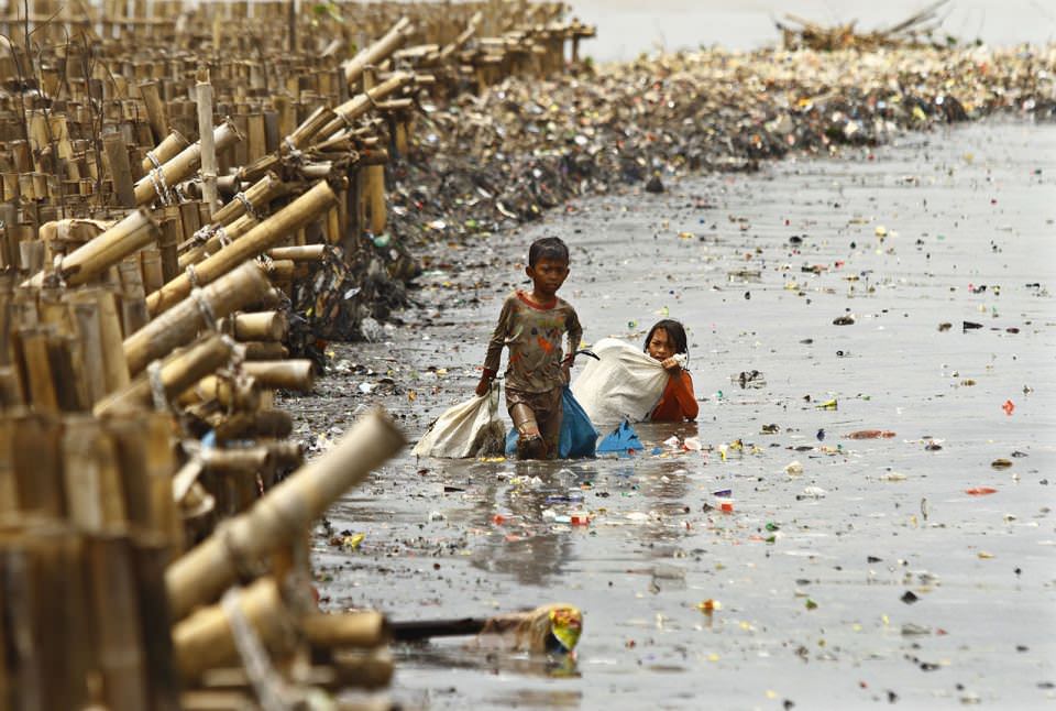 Endonezya'nın başkenti Jakarta'da denize kıyısı bulunan sahil köyünde, çocuklar dalgaların kıyıya sürüklediği plastik çöp ve atık topluyor.