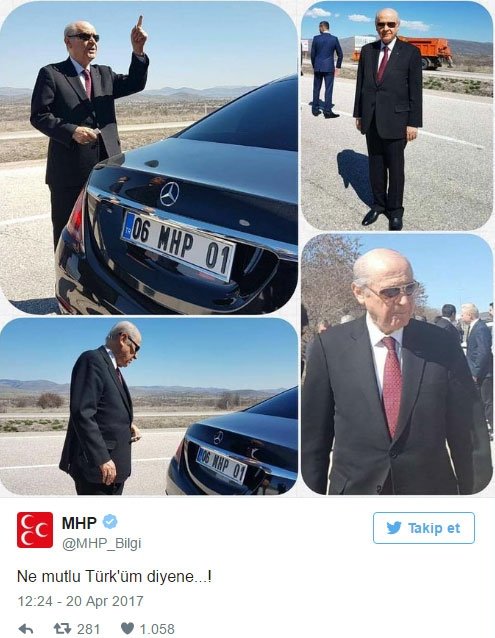 Güneş gözlüğü takmış halde fotoğrafı yok denecek kadar az olan Devlet Bahçeli bu defa şaşırttı. MHP'nin resmi Twitter adresinnden paylaşılan fotoğraflarda Bahçeli'nin güneş gözlüklü, makam arabasının dışında, yol kenarında inceleme yaparken çekilmiş hali görülüyor.