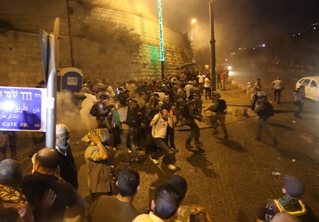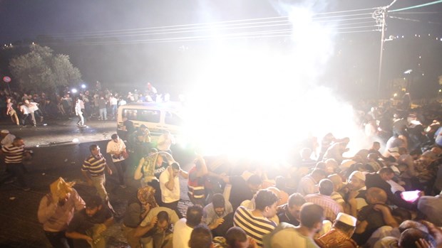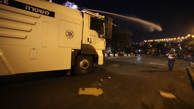 Mescid-i Aksa'nın kapısına yerleştirilen elektronik dedektörlerden aranarak içeri girmeyi reddeden ve namaz kılmak için Aslanlı Kapı (El-Esbat) önünde toplanan Filistinlilere İsrail güçleri plastik mermi, ses bombası, göz yaşartıcı gaz ve tazyikli suyla müdahale etti.