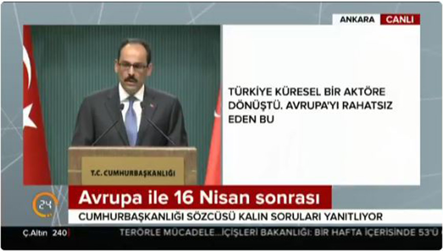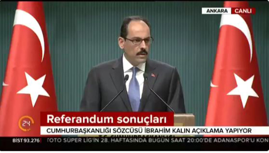 İbrahim Kalın, "Şunu bilsinler ki bizim için her şey daha yeni başlıyor, yeni bir sayfa açılıyor. Yeniden ve yine Türkiye, kendi milli imkan ve kaynaklarıyla, kendi milletinden aldığı güçle bölgesinde ve dünyada etkin bir aktör olmak için çalışıyor. Belki birilerini rahatsız eden budur. Referandum sonuçlarından rahatsız olmalarının sebeplerinden belki bir tanesi budur. Çok açık ifade edeyim. Tayyip Erdoğan'ın bileğini bükemedikleri için algı operasyonları üzerinden, 'darbedir, suikasttir' bu gibi söylemleri normalleştirmeye, sıradanlaştırmaya çalışarak kendilerine bir alan açmaya çalışıyorlar ama burada hezimete uğrayacaklarını çok rahatlıkla söyleyebiliriz. Boşuna bu konularda herhangi bir heves içinde bulunmasınlar." diye konuştu.