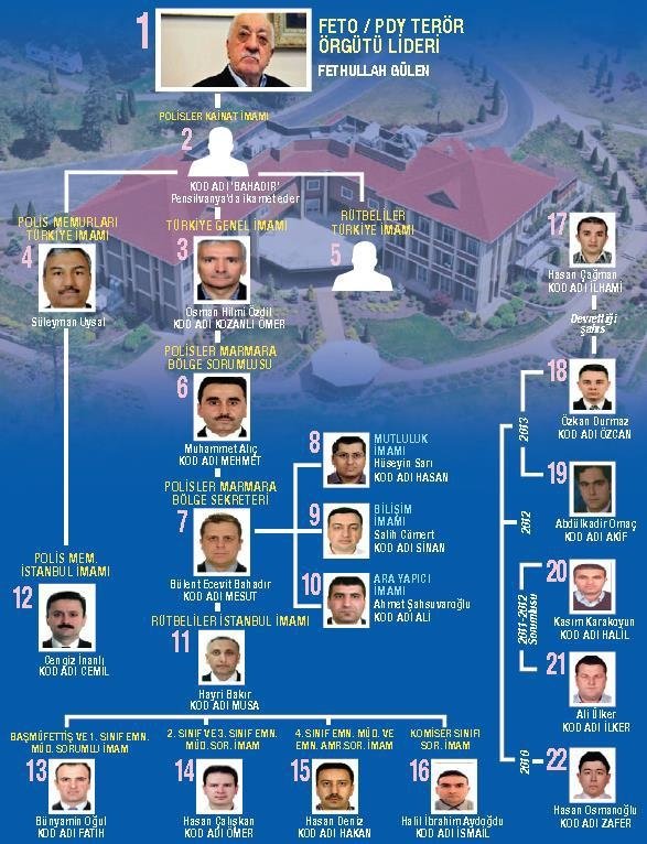 Polis aylar süren titiz çalışmaların ardından, büyük kısmı sivillerden oluşan Türkiye'deki emniyet yapılanmasını 7 bölge halinde şema üzerine aktardı. Marmara Bölgesi şemasında, 1 numara olarak "FETÖ/PDY Terör Örgütü Lideri" ismiyle Fetullah Gülen yer alıyor. Gülen'in altında, Kod adı Bahadır olan ve Pensilvanya'da yaşayan "Polisler Kainat İmamı" bulunuyor. Bunun altında ise "Polis Memurları Türkiye İmamı" (Süleyman Uysal), "Türkiye Genel İmamı" (Kozanlı Ömer-Osman Hilmi Özdil) ve "Rütbeliler Türkiye İmamı" yer alıyor. Süleyman Uysal, "Polis Memurları İstanbul İmamı"ndan sorumlu. Kozanlı Ömer de "Polisler Marmara Bölge Sorumlusu"na (Kod adı Mehmet- Muhammet Alıç) talimat veriyor. Alıç'a bağlı olan kişi ise, "Polisler Marmara Bölge Sekreteri" (Kod adı Mesut-Bülent Ecevit Bahadır). Bahadır, emri altındaki "Rütbeliler İstanbul İmamı"na, "Mutluluk İmamı"na, "Bilişim İmamı"na ve "Ara Yapıcı İmam"a talimat veriyor. Bunların altında da başmüfettişler ile çeşitli sınıf emniyet müdürleri, memur ve komiserlerden sorumlu imamlar yer alıyor.
