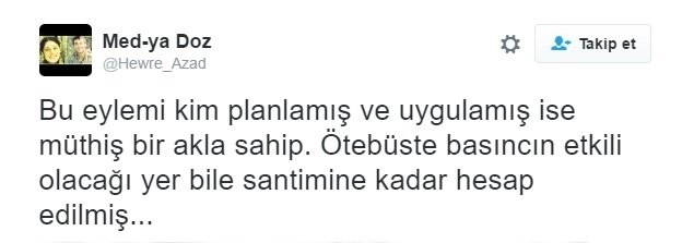 Sosyal medyadan gelen tepkiler üzerine Hürriyet Gazetesi haberi kaldırmak zorunda kaldı. Sosyal medya kullanıcıları "Hürriyet terörün ekmeğine yağ sürüyor. Teröre rağmen normal hayatına devam eden insanlar üzerinde infial yaratarak ne yapılmak isteniyor? Bu habercilik anlayışının o bölgede bomba patlatmaktan farkı yoktur" şeklinde tepki gösterdi.İŞTE O SKANDAL TWEET