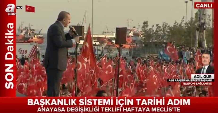 AHaber'e açıklamalarda bulunan A&G Araştırma Şirketi Başkanı Adil Gür, Yeni Anayasa teklifine ilişkin yapılacak referandum ile ilgili yaptığı açıklamada şöyle konuştu: Ak Parti'nin 317 tane milletvekili var ve fire beklemiyorum. Farklı siyasi partilerden de evet oyu gelebilir, MHP'den de yüksek oranda evet oyu gelebilir. Şayet 330 evet oyu bulunamazsa ki olmayacaktır. Referandum için yaptığımız araştırmalarda, 15 Temmuz'dan sonra Cumhurbaşkanı'na teveccüh çok üst düzeye çıktı, Cumhurbaşkanı'na sempati duyan isimlerin birçoğu evet diyor. 15 Temmuz'dan sonra daha etkin karar alınması açısından, sistem değişikliğine destek de bir artış var. Araştırmalarda da sonucun evet çıkması adına bir sürpriz çıkmayacağını düşünüyorum. Şimdiden hayırlı olsun diyorum. Sistem değişikliği fiili olarak yapılmıştır, hukuki boyutunun kazandırılacağı kanaatindeyim.