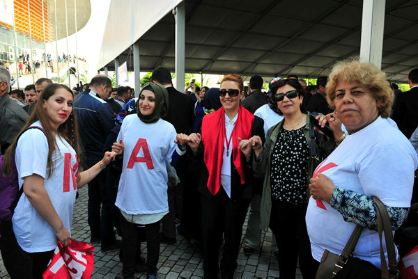 Ankara dışından otobüslerle gelen partililer, Atatürk Kültür Merkezi alanından tezahüratlar eşliğinde kongrenin düzenleneceği salona kadar yürüdü.Spor salonu önünde ve çevresinde bekleyenlere kumanya ve su servisi yapılırken partililer, emniyet kontrol noktalarında yapılan aramanın ardından salona alındı. Salona giremeyen partililer için dışarıda çadır ve dev ekranlar kurulduSalon içinde ve dışında AK Parti seçim şarkıları çalınırken, partililer şarkılara eşlik etti ve tezahüratlarda bulundu.