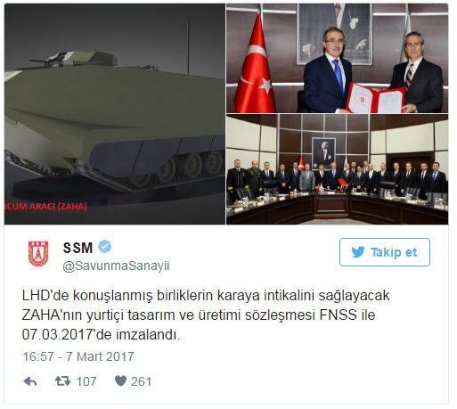 Savunma Sanayii Müsteşarlığı (SSM) ile FNSS Savunma Sistemleri AŞ arasında, zırhlı amfibi hücum araçlarının (ZAHA) yurt içi tasarım ve üretimini kapsayan sözleşme imzalandı.