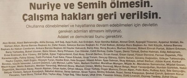İçinde kendilerine sanatçı ve aydın diyenlerin bulunduğu 111 kişi, terör örgütü DHKP-C bağlantıları nedeniyle görevden alındıktan sonra tutuklanan Nuriye Gülmen ve Semih Özakça, için gazetelere ilan vererek işe iade edilmelerini istedi.