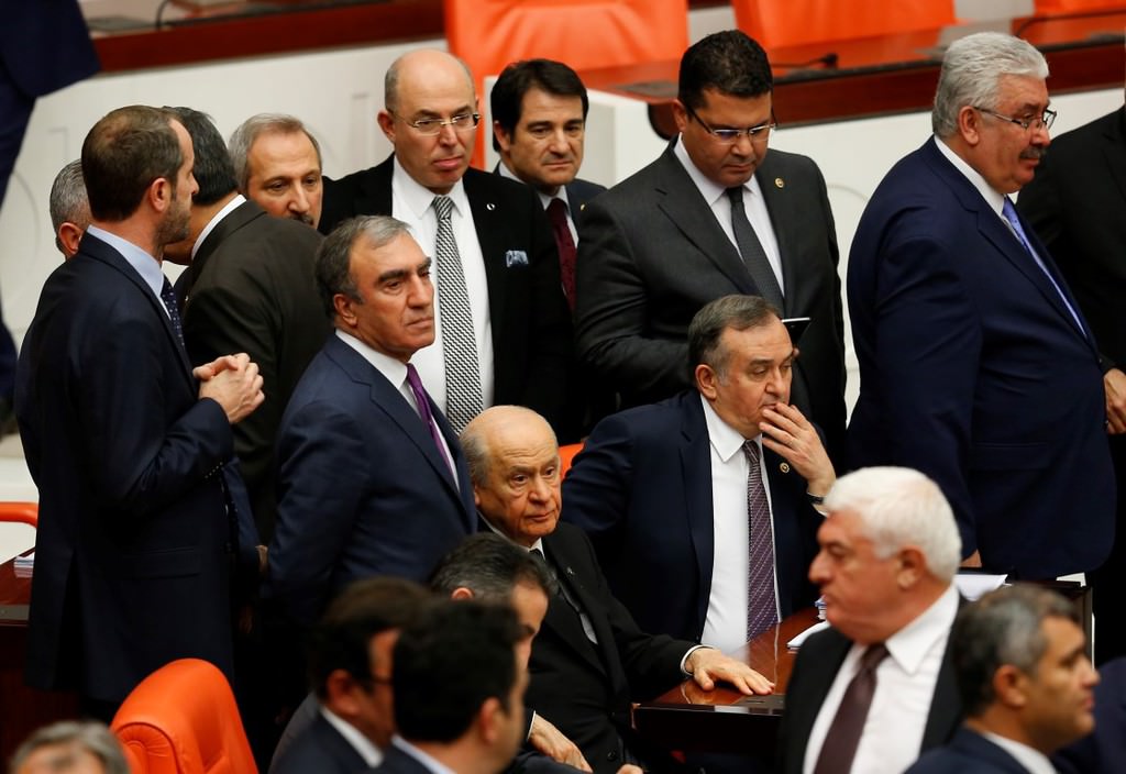 MHP Genel Başkanı Devlet Bahçeli, TBMM'de basın mensuplarına yaptığı açıklamada, "Anayasa değişikliğinin Meclis'te referandum yolu açık olarak kabul edileceği görülüyor. Görüşmelerde özellikle gerilim stratejisi izleniyor. Meclis'teki gerilim, referandum sürecinde Türkiye geneline yayılabilir. Anayasa Meclis'ten geçmezse parlamento yenilenmeli" diye konuştu.