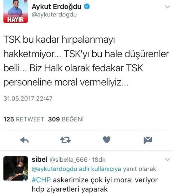 Takipçilerinden biri, "CHP, askerimize çok iyi moral veriyor, HDP ziyaretleri yaparak" sözleriyle Erdoğdu'nun açıklamasını eleştirdi.