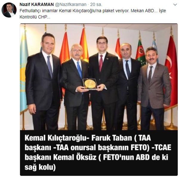 Sabah gazetesi özel İstihbarat şefi Nazif Karaman, FETÖ imamlarıyla Kılıçdaroğlu'nun aynı karede yer aldığı iki fotoğrafını sosyal medyada takipçileri ile paylaştı.
