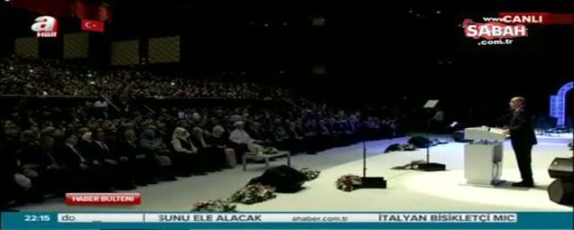 "Suriye'de katledilen, önemli bir bölümü de çocuk olan 1 milyona yakın masumun sesine kulak vermeyen bir Müslüman, kendisini Peygamber Efendimizin bu tavsiyelerinden hangisine uymuş olarak kabul edebilir? Hepiniz ekranlarda izlemişsinizdir, kimyasal silahlarla şehit olmuş ikizlerin babasının kucağındaki halini. Türkiye'ye aldırdık ve Hatay'da babası, amcası ve akrabalarıyla görüştüm. Aynı aileden 100 kişi kimyasal silahlarla ne yazık ki ölmüş, şehit olmuştu. Şimdi o babanın halini düşünün, eşi de şehit olmuş, iki yavru da gitmiş. 'Ben onları Allah'ımın evine gönderiyorum.' diyordu. Kendi elleriyle yavrularını orada mezara defnediyor. Bu dünyada bu zalimler, acaba karşılığını ne kadar bulmayacak da bu zulmü devam ettirecek. Bunlara karşı sesimizi yükselttiğimiz için birileri ne diyor? 'Diktatör' diyor. Varsın desinler, biz sesimizi yükseltmeye bunlara karşı devam edeceğiz. Çünkü bizim Peygamberimiz 'Zulme rıza zulümdür' diyor. Zulme rızanın zulüm olduğu bir dünyada biz kalkıp da bunlara 'İyi yapıyorsunuz. Devam edin.' diyebilir miyiz?"