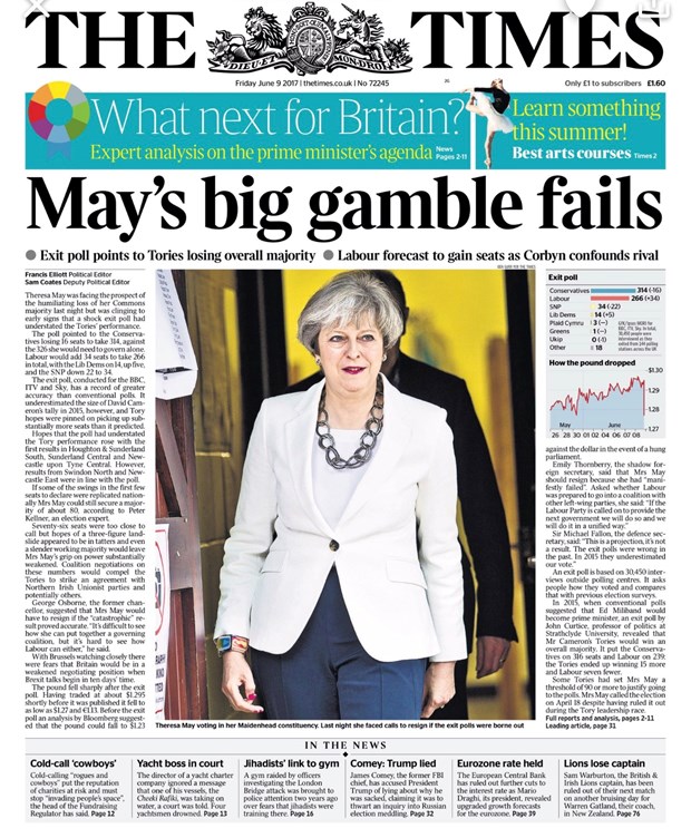 Gazeteler bugün söz birliği etmişçesine aynı manşetlerle okuyucularının karşısına çıktı. The Times 'May'in büyük kumarı başarısız oldu', Financial Times, 'Çıkış anketlerine göre May'in seçim kumarı geri tepti, The Guardian 'May'e sandık çıkış anketi şoku' ve Independent 'May'in seçim kumarı geri tepti' başlıklarını kullandı.