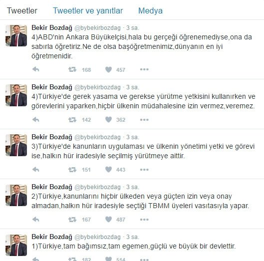 Adalet Bakanı Bekir Bozdağ, Türkiye'de yasama ve yürütmenin, yetkisini kullanırken ve görevlerini yaparken, hiçbir ülkenin müdahalesine izin vermeyeceğini belirterek, "ABD'nin Ankara Büyükelçisi, hala bu gerçeği öğrenemediyse, ona da sabırla öğretiriz. Ne de olsa başöğretmenimiz, dünyanın en iyi öğretmenidir." değerlendirmesinde bulundu.